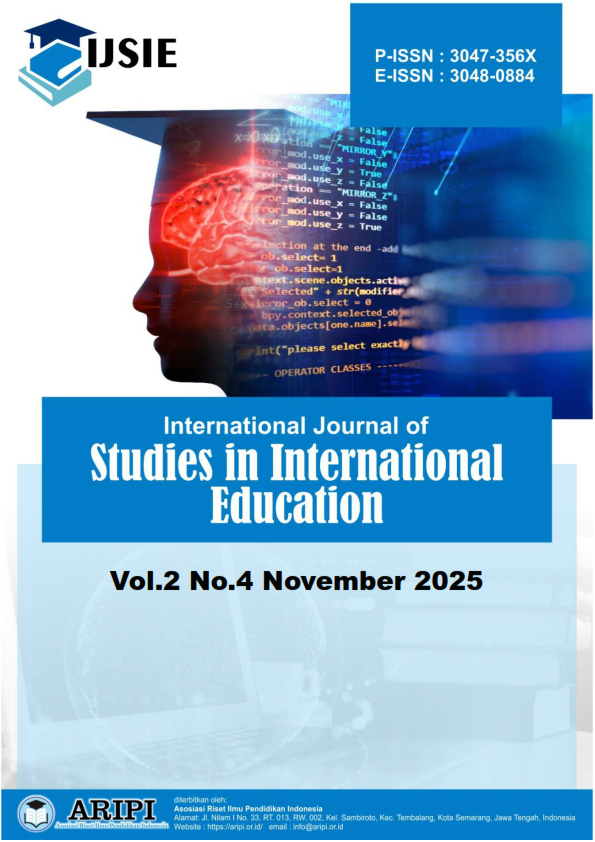 International Journal of Studies in International Education; This a journal intended for the publication of scientific articles published by Asosiasi Riset Ilmu Pendidikan Indonesia. This journal contains studies in the fields of law and social politics, both theoretical and empirical. The fields of study in this journal include the sub-groups of Educational Sciences, Social Sciences, Language and Literature, Sports and Health, Mathematics and Mathematics and Natural Sciences, Technology and Vocational Sciences, Educational Sciences and Arts. This journal is published 1 year 4 times (February, May, August and November)